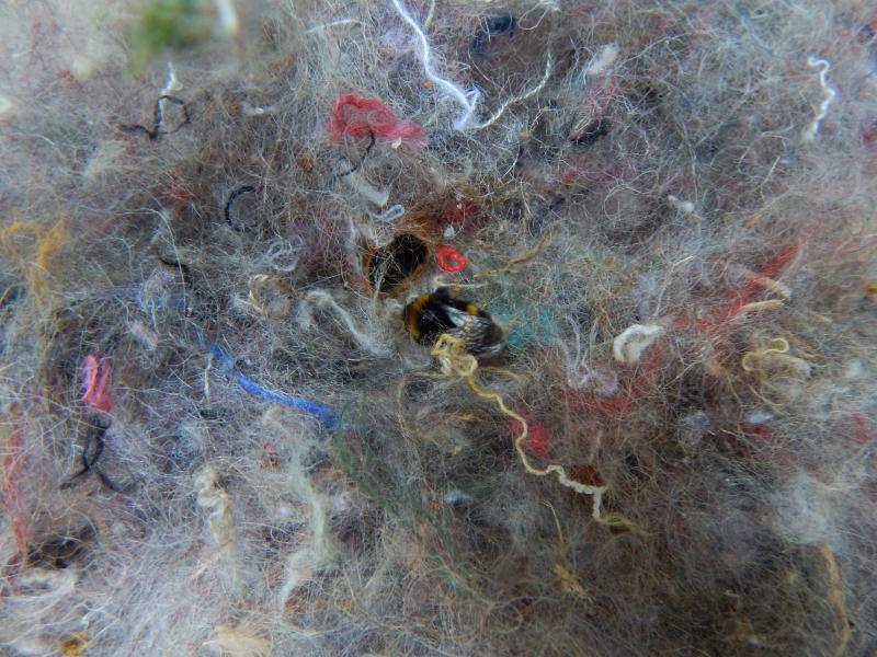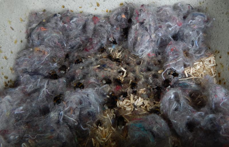Unser Hummelstaat entwickelt sich schneller als gedacht. :oDerzeit ca. 50 Hummeln ! :DDen verdeckten "unterirdischen" Zugang über die Eingangsröhre zum Bau haben sie wieder mittels 3 Kanäle freigemacht.Von den Hummeln wurde der Nestbau auch auf den restlichen Raum außerhalb des mit Polsterwolle bedeckten Bereiches erweitert.Sie haben die Fläche nun komplett unterhölt und mit der Kleintierstreu die Polsterwolle des ursprünglichen Baues teilweise zugedeckt.Daher habe ich heute zusätzliche fein zerrupfte Polsterwolle dazugegeben.Die haben sie auch sofort umdrappiert und zum Bauen verwendet. War also höchste Eisenbahn.Wußte nur nicht , daß ich heute ne dicke Lippe riskieren würde.Das Hummelvolk ist extrem wehrhaft . Bei der Inspektion und "Erweiterung" wurde ich von ca. 20 Hummeln angegriffen.Mehrere Hummeln schmissen sich im Nest auf den Rücken und drohen mit dem Stachel und/oder schossen mit Kot.Die Fliegende Abwehr flog ständig auf Kollisionskurs gegen mich.Eine hat mich in die Oberlippe und eine zweite in die Wange gestochen. :'(Dann tränten mir die Augen und die Lippe schwoll schmerzend an.Einige Kampfhummeln ließen sich erst in ca. 20m Entfernung abschütteln. Nachdem ich sie mit Zuckerwasser versorgt hatte , waren sie deutlich entspannter.Es wäre kleverer gewesen , sie vorher abzufüllen.