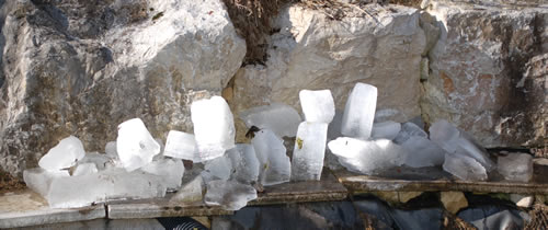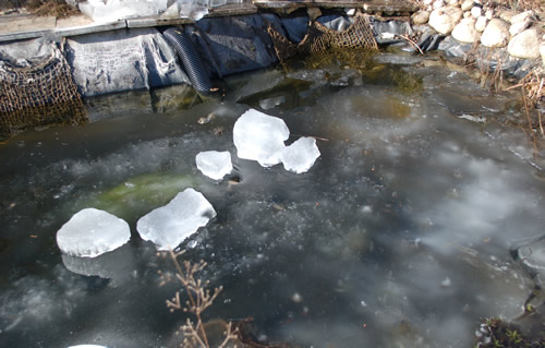 Gestern bin ich noch auf dem Eis des Teiches gestanden, es muss noch recht dick sein. Der Entlüfter nützte schon lange nichts mehr. Ein Bambusstab den ich herausziehen konnte, zeigte eine Eisdicke von gegen 30 cm an.