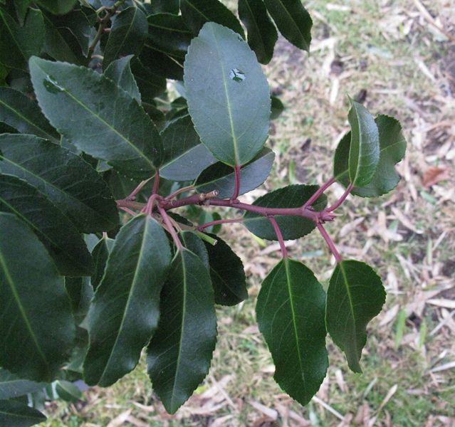 Hat sie im Sommer leuchtend rote Jungtriebe und rote Blattstiele?Das Laub des normalen Prunus lusitanica müsste eigentlich rundlicher sein.
