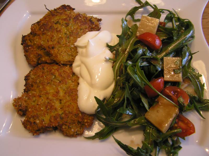 und heute mal wieder quinoa-gemüsepuffer mit zitronen-knoblauchdip und rucolasalat mit tomätchen und parmesan