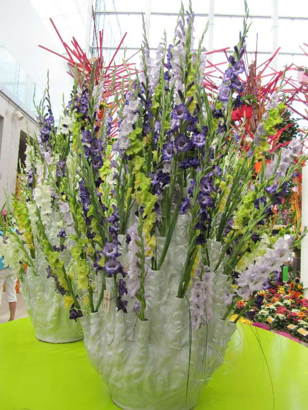 Ich war auf der Floriade, allerdings nur einen guten halben Tag. Angesehen habe ich mir die große Ausstellungshalle (wir hofften auf viele Lilien, aber es gab nur wenige Arrangemangs. Dafür lief gerade ein Wettbewerb in Sachen Anthurien (habe ich im Glashaus schon gezeigt) und Crocosmien. Interessant fand ich diese Verwendung von Gladiolen.