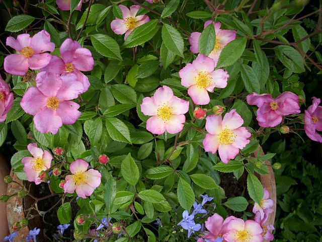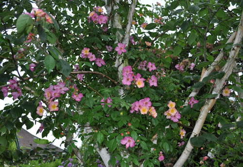.Die eine, Mutabilis, in einer Reihe von etwas delikateren Rosen, wie u.a. Sanguinea und Drei Gleichen.Hingegen die Plaisanterie rankt sich in einer Himalajabirke hoch. Das zarte Geäst der Birke und die feingliedrige Plaisanterie passen bestens zusammen. Bis in 3 m Höhe, trotz Frostschäden, leuchtet sie mit ihren unterschiedlichen farbigen Blüten herunter und dazwischen hervor.Leider sind die Bilder nicht so schön wie es hier aussieht.Stell dann mal ein Bild ein.