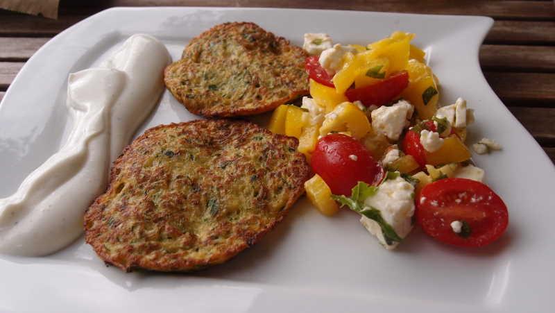 und heute zucchinipuffer mit angemachtem quark und ein salat aus tomaten, paprika und schafskäse