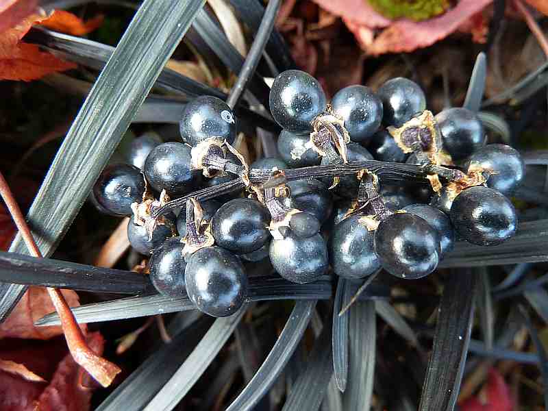 Man muss sich schon tief bücken, um sie zu sehen, die schwarzen glänzenden Beeren von Ophiopogon planiscapus 'Nigrescens'. Aber ich freue mich immer über sie, vor allem bei dem fallenden Laub eines roten Ahorns.Und sie bringen Nachwuchs. Irgendwie mag es Ophiopogon bei mir und vermehrt sich ständig.
