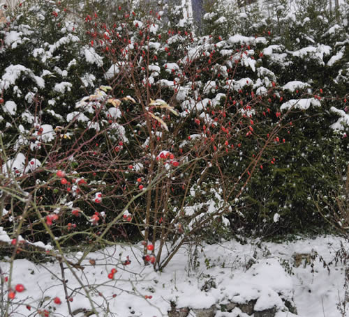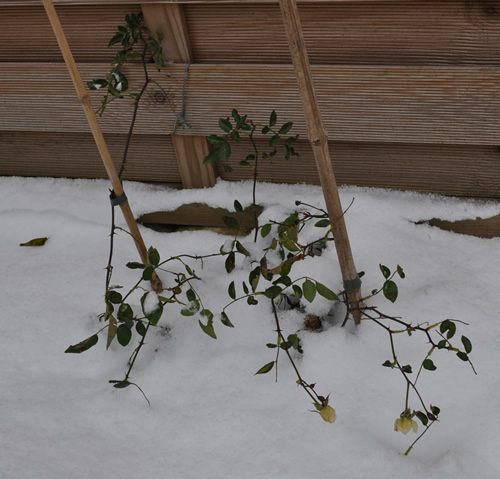 François Faucard, eine Wichurana-Hybride, hält sich tapfer über Schnee mit einer Knospe und einem Blütchen.Nächstes Jahr hoffe ich da einen rechten "Rosenhaufen" zu sehen.