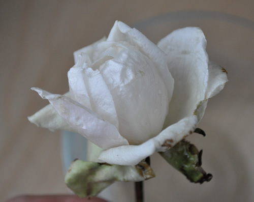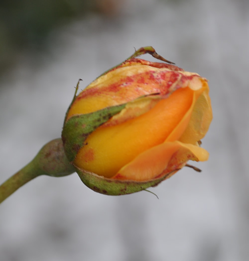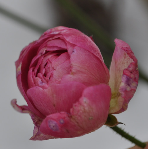 Mme Eugène Resal hat auch noch zwei Blüten, die langsam aufgehen, trotz Schnee und Eis.