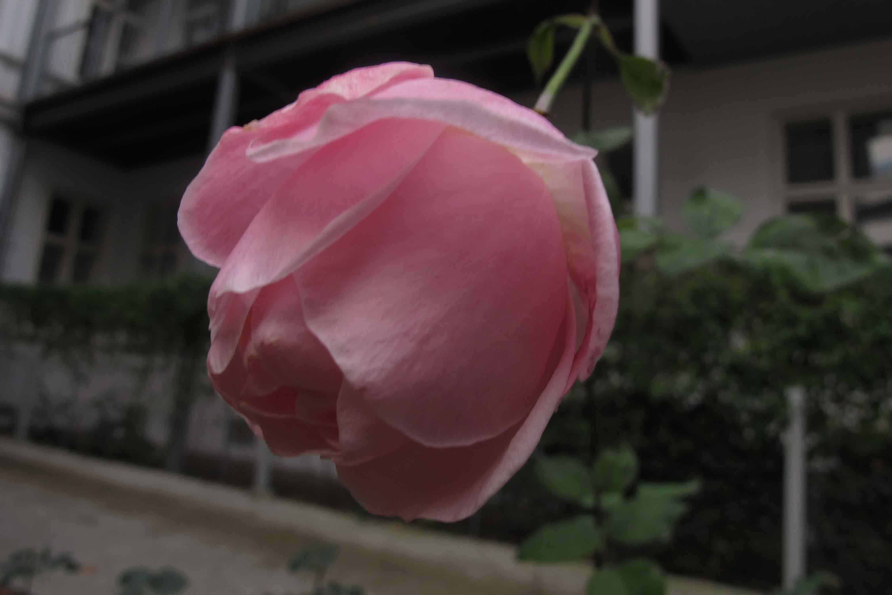 ! Ich hab nur noch eine Kuriosität: Marie Curie hier im Hof, eine Altlast gewissermaßen, die eine seit Wochen unveränderte Kospe doch noch geöffnet hat, ganz ohne den kleinsten Sonnenstrahl. Ganz rosa ist sie jetzt und Star des Hauses