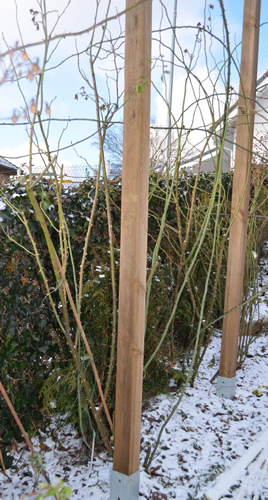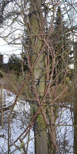 Wenn die Blätter weg sind, sieht man die Wickelung besonders gut.Bleu Magenta, auch eine sehr Widerspenstige für den Pfahl. Da muss man früh genug wickeln, solange die Triebe noch grün und etwas biegsam sind. Nach etwa drei Jahren sollte man dann wieder mal altes, dürres und verletztes Holz rausschneiden.