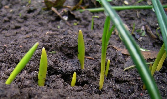 Wenn die ersten Spitzen aus der Erde schauen sieht man drei Blätter, ähnlich wie bei Tulpen oder Erythronium. Auf diesem Foto sieht man im Vorgrund noch so einen kleinen Nachkömmling.