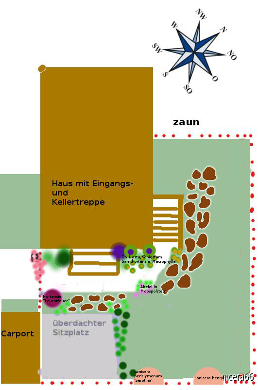 Es steht dort jetzt nichts heimisches: Loorberkirsche als Hecke, ein paar exotische Bodendecker...In Beratung mit Männe,und Theodors Vorschläge miteinbeziehend hier ein Entwurf im Anhang.Das komische braune Quadrat links neben dem Eingang ist mein hängendes Vogelhäuschen...und einen Naturstein Plattenweg habe ich den Rasen eingesetztÜber dem Sitzplatz eine Persenning, die habe ich noch ;DWie wäre das? Edit: An alle, die hier so fleißig Vorschläge und Links posten: lieben Dank, das ist alles sehr informativ
