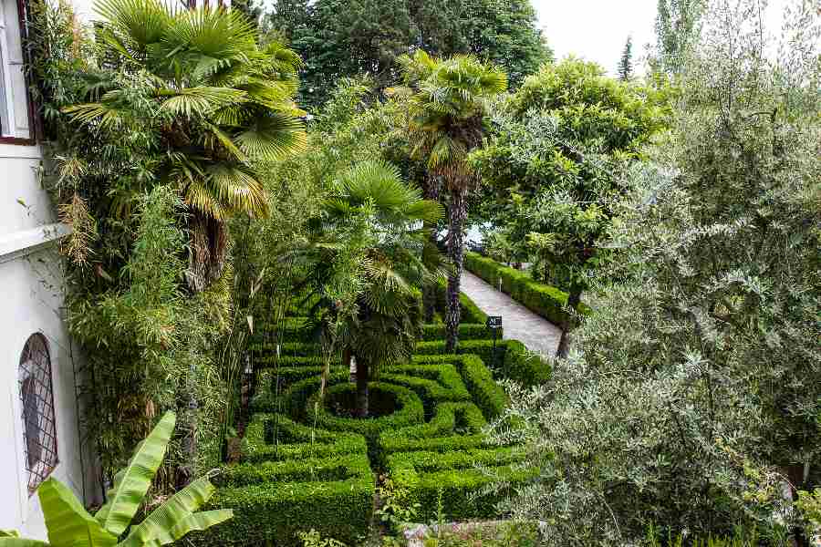 Sehr idyllisch ist dort Buchsbaum mit Palmen, Bambus und Rosen kombiniert.