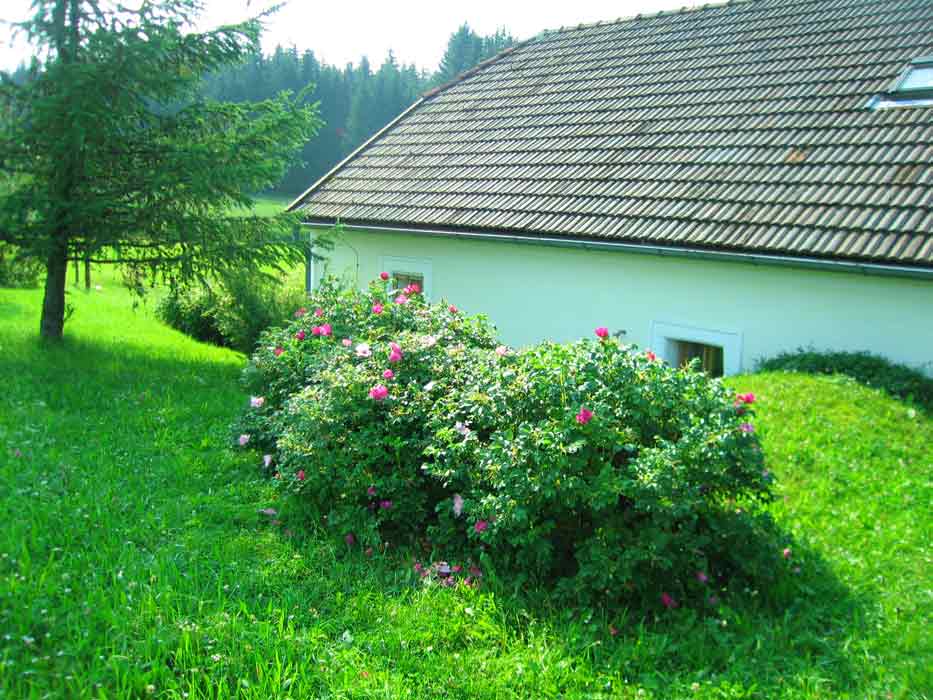 In unserer Gegend gibt es noch ein paar alte Erdkeller für Kartoffel etc., ich erinnere mich aber nicht, irgendwelche Lüftungsrohre gesehen zu haben. Wir haben auch einen an der Nordseite unseres alten Hauses, das in den Hang gebaut ist. Im Zuge der Renovierung wurde auf Anraten so ein Rohr eingebaut (Auf dem schlechten Foto in den Rosen versteckt), davor ging es offensichtlich auch ohne, die Wände wurden - mehr aus ästhetischen Gründen - gekalkt. Der Boden ist gestampfter Lehm, immer schon, der Zugang ist praktischerweise im Haus. Im Vorjahr mußten wieder einmal die Wände im ganzen Haus geweißt werden, und ich ärgere mich furchtbar, daß ich mich erstmals habe breitschlagen lassen, daß dafür nicht Kalk, sondern eine der gängigen Malerfarben verwendet wurde. Noch nie hatte ich davor Schimmel im Bad, das ebenfalls an der Nordseite liegt, gehabt, nun zeigen sich erste Spuren. Die Alten wußten schon...