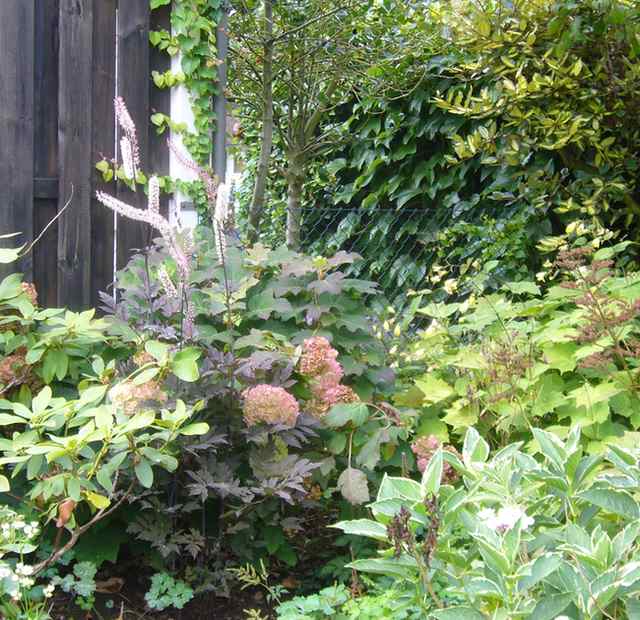 Beengt sieht es bei mir eigentlich überall aus, aber das stört mich nicht ;DUnd die Pflanzen scheinen sich dort auch wohl zu fühlen. Wachsglocke und Rodgersie blühen immer gut, ebenso der Rhododendron links. Die Silberkerze Pink Spike ist noch jung, macht sich aber auch schon gut.Nur mit der Hydrangea Tricolor bin ich so ganz glücklich. Sie gehört anscheinend zu den Sorten, die nach den meisten Wintern nicht blüht. In diesem Jahr hat sie immerhin einen Blütenstand.Für meine Eichblatthortensiensorte habe ich im Netz eine Höhenangabe von 1-2 m gefunden. Sie kann also durchaus noch höher werden, und dann erfüllt sie ihren Zweck. Etwas darf man von der Wand ruhig sehen, sie bildet einen ruhigen Hintergrund.