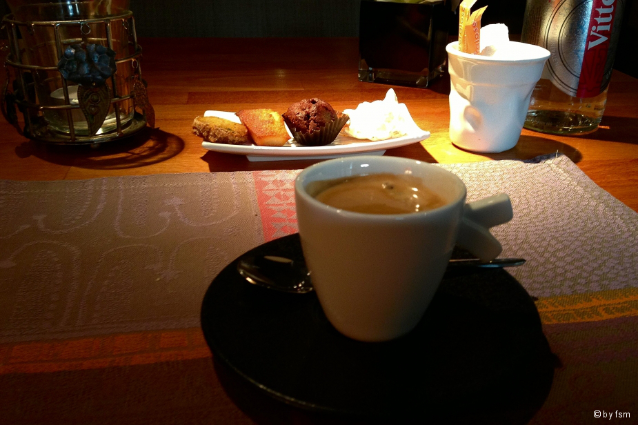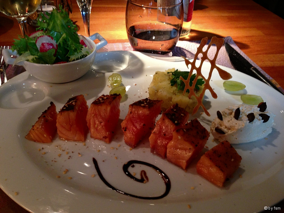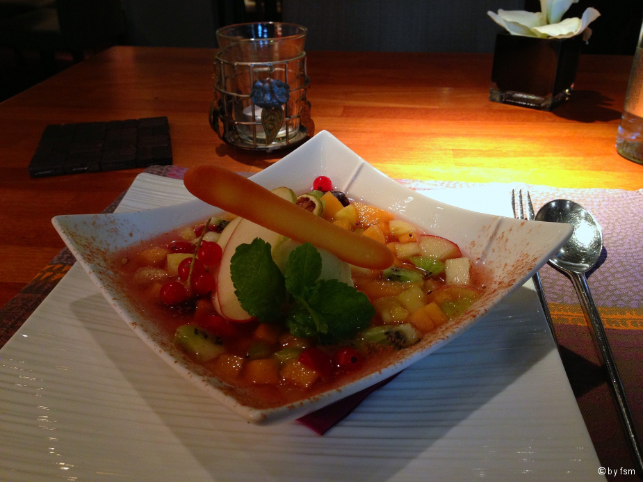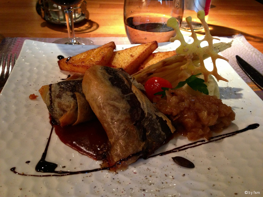 )Dann gab es Cubes de saumon d’écosse fumé maison graines de sésame, sauce raifort et salade de rattesDanach bestellte ich als Hauptgericht Boudin noir maison aux oignons confits en croustillant, pomme de terre purée et fenouilAls Dessert passt dann nur noch die Soupe de fruits rafraichis à la menthe et gingembre fraisEin Espresso musste sein, die süßen Verführungen habe ich nicht mehr alle geschafft...!LG FrankPS: Habe u.a. mit dem Einkauf von Pilzen "Pieds de Mouton" und insb. auch den Andouillettes in der sehr schönen Markthalle an der Kathedrale von Metz für heute zugeschlagen...!