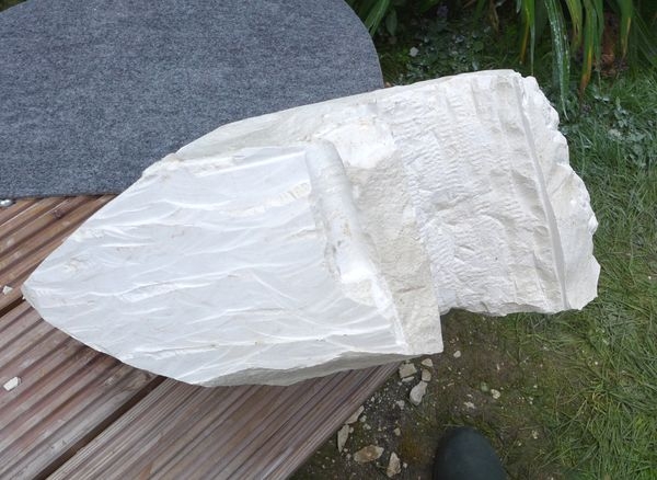 Spannender war für mich die Herausforderung mit diesem Brocken "Finike White Limestone", den mir von einem Baumaterialienhändler geschenkt wurde.Beileibe kein weicher Stein (aus dem Süden der Türkei), sondern sehr fest und "kristallin", fast schon wie Marmor.