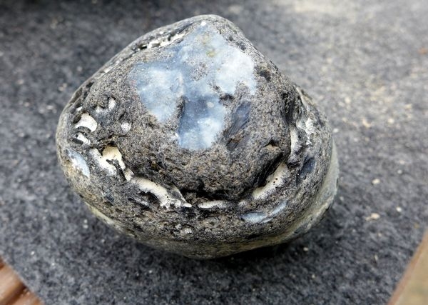 An das Meer erinnern für mich der in diesem entstandene Kalkstein, der von den Wellen und der Zeit glatt geschliffene Flinstein (welcher wundersamerweise ein blaues "Auge" hat) und der auslaufende Schwung der linken Steinseite.