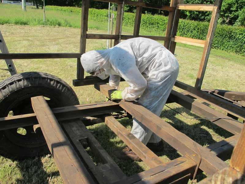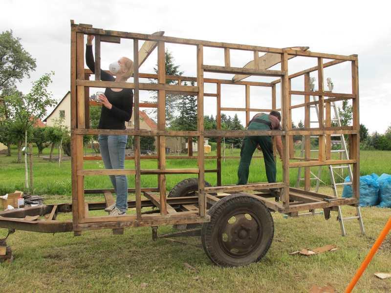 Das wäre ein güldener Käfig. ;)Nachdem wir den Oberbau des Bauwagens bis auf das Gestell abgerissen hatten, wurde dieses mit Holzschutzmittel gestrichen. Man sieht jetzt auch die Unterkonstruktion - eine Lafette, über die Balken gelegt wurden.