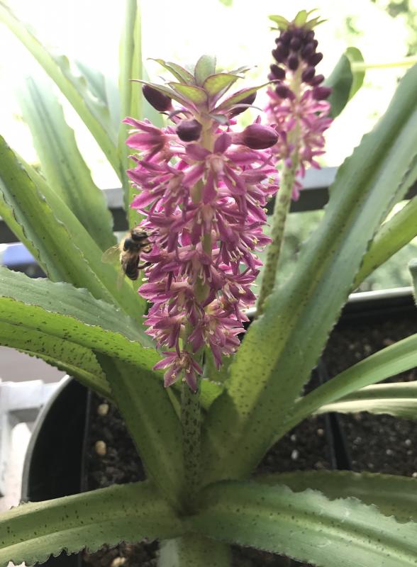 Hier stehen die Eucomis erst in den Startlöchern. Bin mal gespannt, was sich aus den Samen von E. comosa entwickelt hat, die ich vor einigen Jahren ausgesät habe.