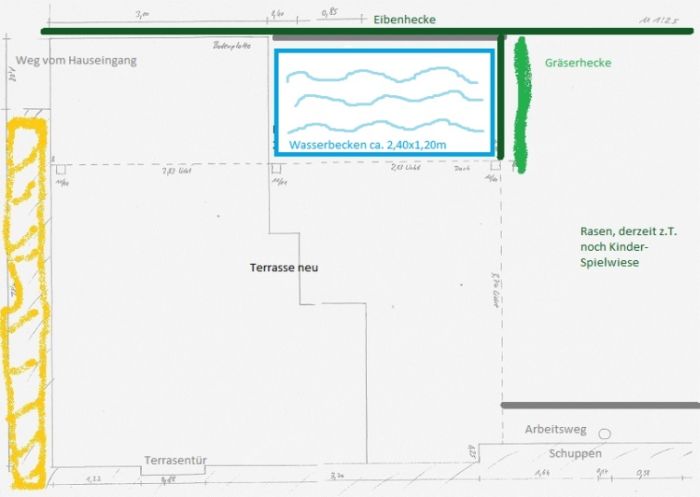 Ich habe jetzt das Wasserbecken mal "maßstabsangelehnt" vergrößert und die Gräserhecke skizziert. Ist entschieden mein Favorit.Auch den Thread zu den Wasserbecken habe ich noch mal gelesen. Erschrocken war ich ein wenig über die Kosten für ein GFK-Becken in 2,40x1,20m, oha... Könnte das so auch funktionieren, wie hier beschrieben oder spricht was dagegen? Bin da der absolute "Nicht-Handwerker"...