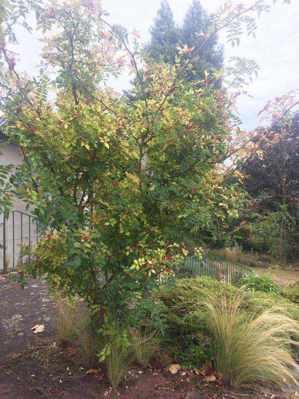 ... ca. 2 Jahre später, geschätzt. Jetzt sitzt das kräftig gewachsene Bäumchen voller Rispen mit hellroten Fruchtkügelchen.
