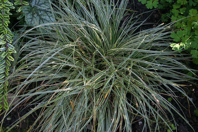 Dieses Gras kaufte ich vor mehr als 10 Jahren bei Hans Simon als 'Icedance'. Obwohl es mir mit seiner Winterfestigkeit sehr gefällt Und als Schirmherr von Cyclamen sowieso, warte ich darauf, dass es ausläufert. Tut es aber nicht, auch wenn aus dem Pflänzchen ein Trumm wurde. Also lein 'Icedance'?Standort humoser Lehm, halbschattig; wird eingeigelt von Camp. poscharskyana, Helleborus und VeilchenDieses Gras ist ja wintergrün, ich mag es sehr. Da weiß ich immer nicht, ob ich es im Frühling zurückschneiden soll.lg elis