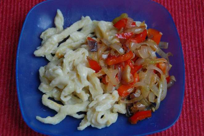 .Bei mir gab es heute in etwas Butter angebratene und mit Emmentaler überbackene Spätzle (Mehl, Ei, Salz, Wasser). Dazu gebratene Zwiebeln und Paprika. Lecker!