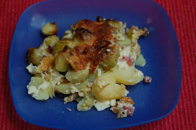 Bei mir gab es Rosenkohlauflauf (Rosenkohl, Kartoffeln, Schinkenwürfel, Gouda, Ei, Sahne, Schmand, Salz und Pfeffer, Muskat). Für das vegetarische Kind ein Extrapfännchen ohne Schinken.