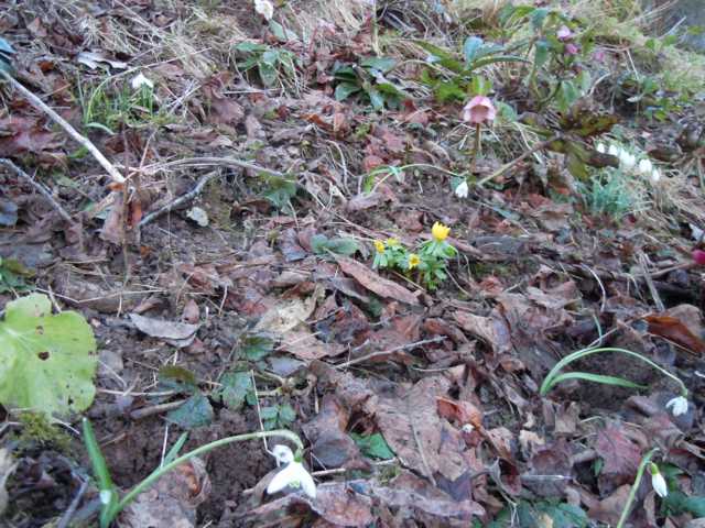 Ich bin gespannt, wie gut sie an dem schattigen Hang klarkommen. Das dürften die gleichen Verhältnisse sein, wie unter einem dunklen Nussbaum.Und überall dazwischen die Glückchen (und ein paar Winterlinge)