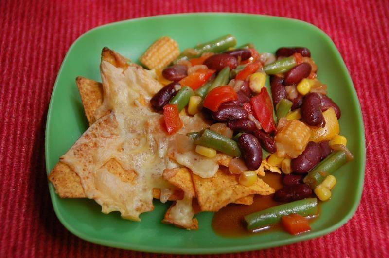 :Tortillachips mit Käse überbacken und mexikanische Gemüsepfanne (Fertigprodukt aus Paprika, Bohnen, Zwiebeln, Mais, Kidneybohnen, etc; plus zusätzlichen grünen und Kidneybohnen und Paprika) dazu