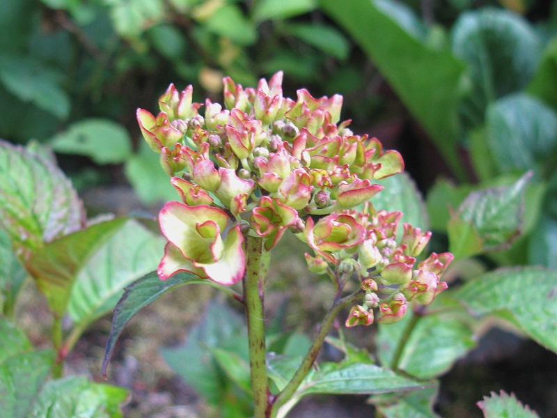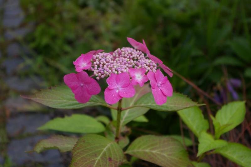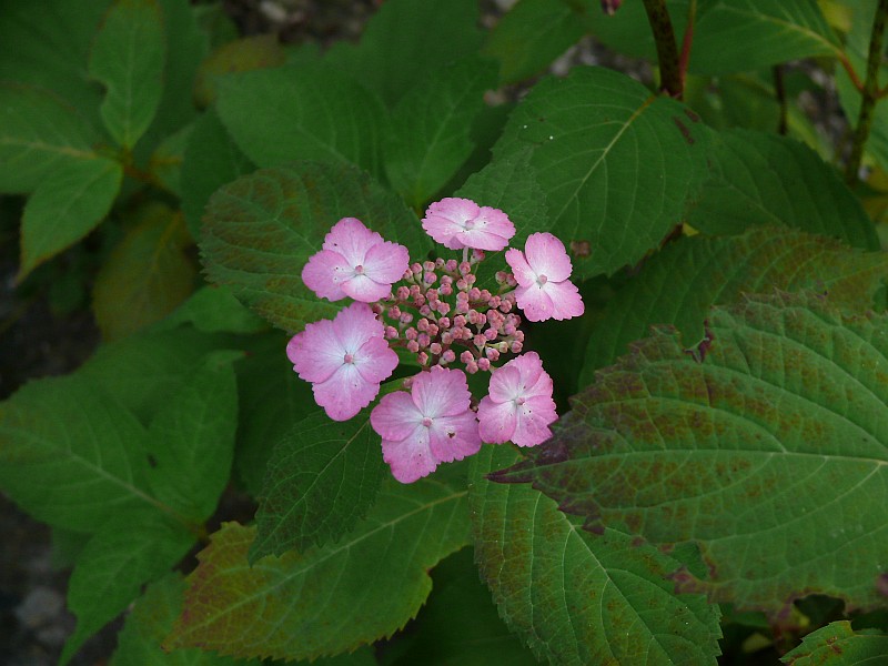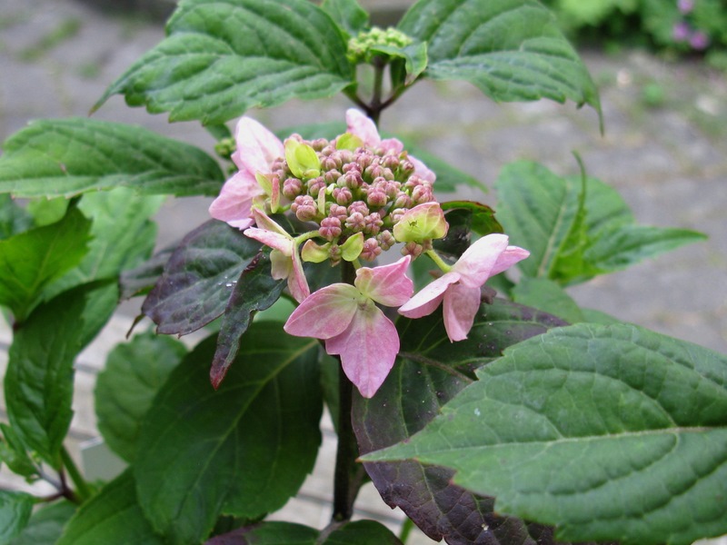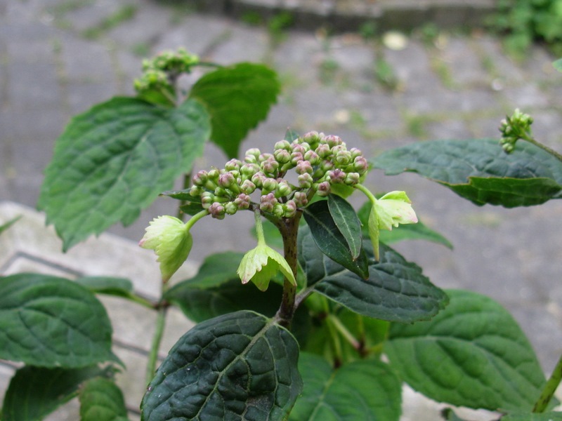 Ziemlich überraschend blühte letzte Woche der erste Hydrangea-Sämling überhaupt und da ich ihn recht hübsch finde, habe ich ihn aus seinem selbst gewählten Bett zwischen Waschbetonplatten und Kieseln rausgepfriemelt und erst mal in einem Topf geparkt. Mal sehen wie er sich weiter entwickelt, er scheint wüchsig zu sein. In der Nähe stehen Hydrangea serrata 'Tiara' und H. serrata 'Preziosa' (und H. paniculata 'Kyushu, aber die dürfte wohl nicht beteiligt gewesen sein).