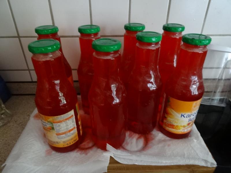 So, hier unsere erste Erdbeer-Sirup-Ausbeute,hergestellt aus drei Kilo Erdberen, drei Kilo Zucker, Zitronensäure und Eimachhilfe.
