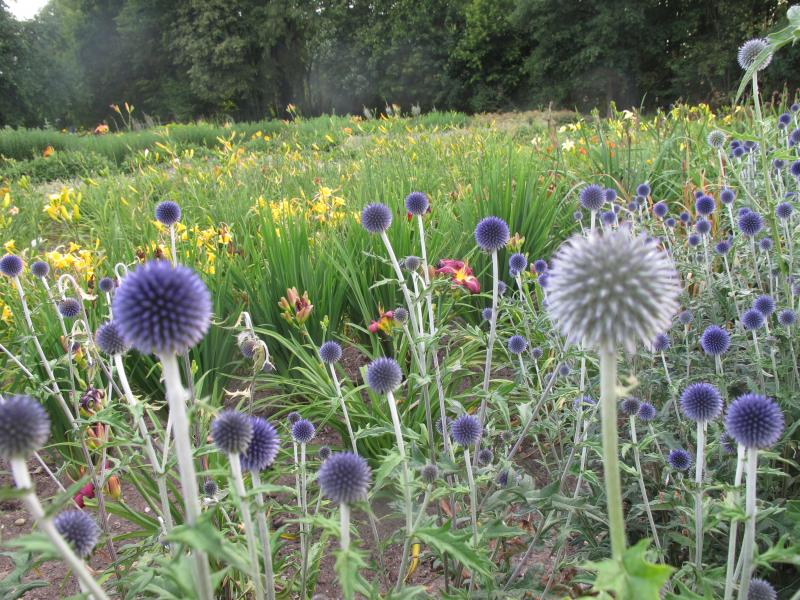 Links 'Veitch's Blue', rechts schlecht fotografiert 'Taplow Blue', links 100-120 cm, rechts 130-150 cm.[ schon beschrieben und ich habs überlesen, mir ist es gerade zu heiß, aber die echte `Veitch´s Blue´ sollte deutlich kleinere Kugeln als die Sorten von E. banaticus oder z.B. E. spharocephalus haben und ein geradezu überirdisches Blau aufweisen. So hab ich sie zumindest in Erinnerung.