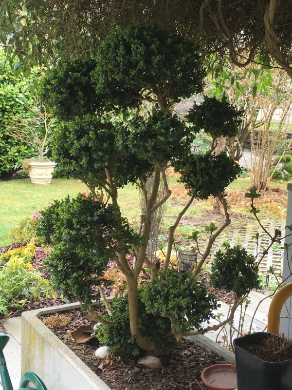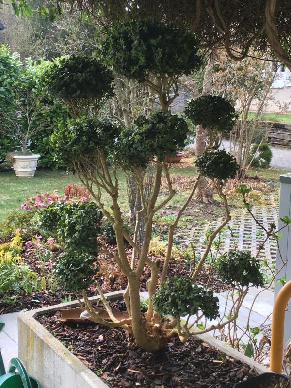 (Er ist übrigens ein `Rotundifolia`meine ich. Und weil er recht grosses Laub hat ist er nicht unbedingt so gut geeignet für so eine Form. Kleinlaubiger wäre besser.)