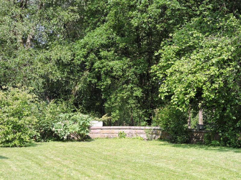 Ah, so bekommt man auf jeden Fall einen viel besseren Eindruck.So ein Wald im Hintergrund gibt eine schöne Kulisse ab. Und der Rasen ist groß genug, um bei der Beetform großzügig und flächig planen zu können!Frangula alnus 'Fine Line' habe ich mir letztes Jahr als kleines Kerlchen bei Hellmut Scholl gekauft, wächst gut, sieht hübsch aus und riecht nicht...Wenn dir der Amberbaum zu groß wird, dann kommt vermutlich auch Amelanchier 'Rainbow Pillar' nicht in Frage, oder? Oder Sorbus 'Autums Spire'...Styrax japonica ist vermutlich wieder zu breit.Viburnum sargentii 'Onondaga'?Oder etwas aus der Ahorn-Familie?Oder ein schöner Obelisk mit Clematis fauriei 'Campanulina Plena'...Noch das versprochene Foto (ein Besseres hab`ich nicht). Links stünde das Haus, die Mauer schliesst an die Hausmauer an. Der Strauch ganz links wird noch verpflanzt, fühlt sich nicht wohl dort. Das Wenige was hier wächst steht an der Mauer.(Keine pflanzlichen Ausbaupläne in diesem Bereich.)