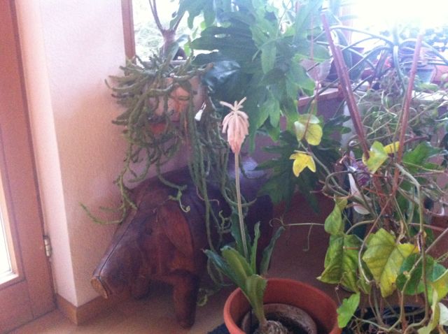 Und unter dem Fensterbrett stehen die Passiflora und die Blutblume, die immer wieder vor die Balkontür gezogen werden.Über die Sau ergießt sich eine Stapelia, die Knospen hat.