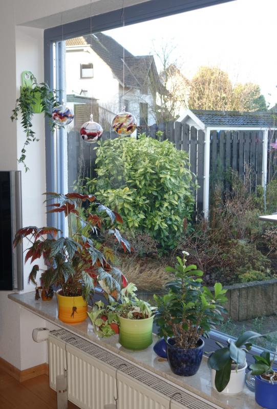 Hier der linke Teil des Wohnzimmerfensters, mit Blattbegonie, bunter Eufeutute, Christusdorn und Orchideen.An der Heizung hängen Wasserbehälter.