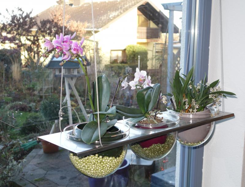 Falls du das Gehänge meinst:War mal ein edles Geburtstagsgeschenk von GG, ist leider teuer und nicht unbedingt praktisch.Ich hatte zunächst Seramis in die Glasschalen gefüllt und die Orchideentöpfe darin versenkt.Leider haben sich ganz schnell Algen hinter dem Glas gebildet, und das sah dann so gar nicht mehr edel aus...Jetzt stehen kleinere Übertöpfe im Glas, mit etwas Dekokieseln.Bohr, Enaira...das sieht aber edel aus...
