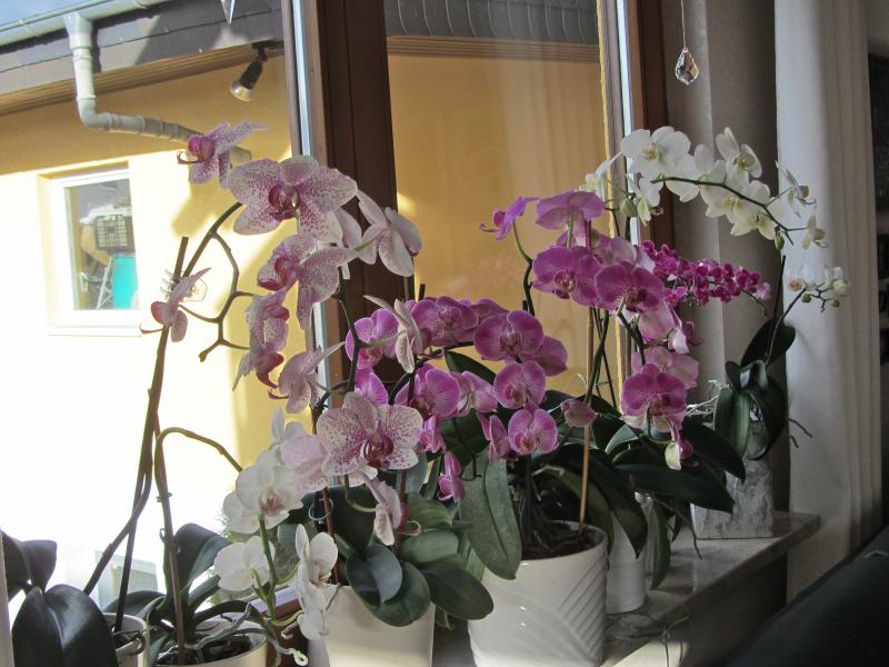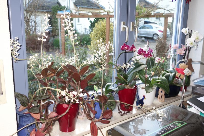 Blüten gibt es derzeit in meinem Arbeitszimmer.Osten, Heizung davor, auf der ich schmale Edelstahlverdunster stehen habe. Diese Orchideen stehen das ganze Jahr über dort, nur die ganz rechts ist neu.