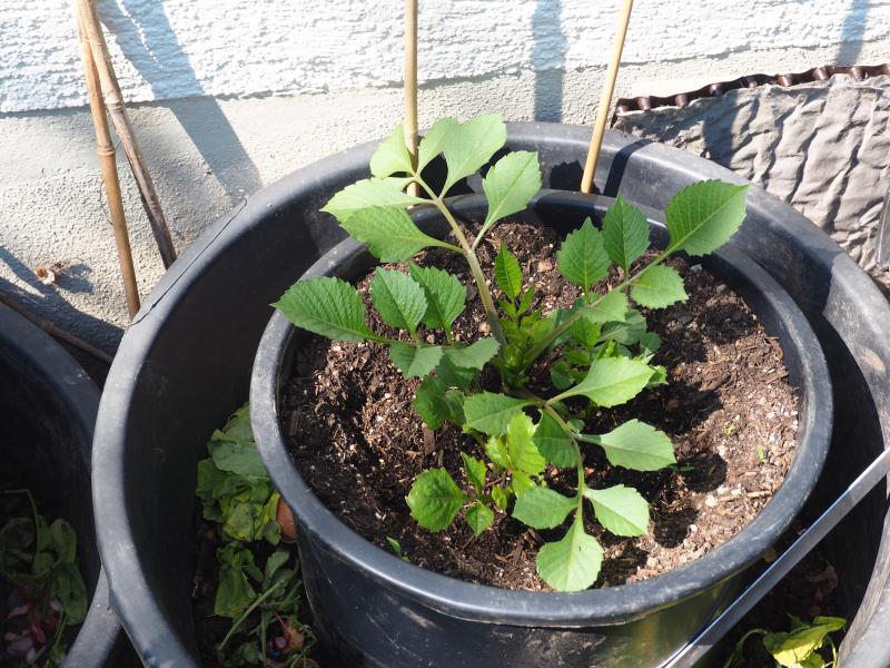 so, die Knollen in ihren Papiertüten und die im Karton sind hierhin und dorthin geschoben worden und dann habe ich zwei große Mörtelwannen freigemacht, die darin gelagerte Komposterde gesiebt und die Knollen in große Pflanzkübel in ein Substrat aus einem Gemisch von torffreier Blumenerde mit guter Komposterde gepflanzt. Das war irgendwann im Mai, nach dem 15. Mai. Die Knollen sahen sehr trocken aus, hatten aber schoin jeweils einen frischen Austrieb.