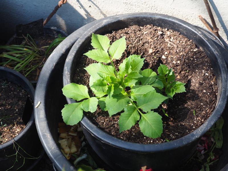 jeder Kübel zwei Exemplare derselben Sorte. In den Mörtelwannen ist unten noch Komposterde drin und um die Dahlienkübel ist auch noch Erde und dort wird weiter kompostiert. Mit schnell kompostierbaren Pflanzenteilen. Es war spannend bis die ersten Spitzen aus dem Substrat ragten, ich hab immer ein bisschen Erde weggeräumt und jeden Tag nachgeschaut.