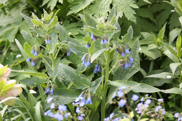 Ich kenne die Unterschiede nicht. Die wuchernde Symphytum azureum/caucasicum, auch hier geht die gärtnerische Nomenklatur kunterbunt durcheinander, ist recht eindeutig zu identifizieren. Hier wurden nie welche hingepflanzt, es standen lediglich mal eine Weile ein paar Töpfe an der Stelle.