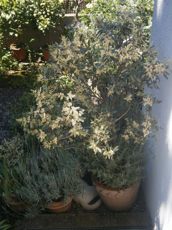 Meine Olivenbäume sind am Blühen, die Bienen bestäuben sie fleißig. Letztes jahr habe ich zum ersten Mal Oliven eingelegt, wobei der kleinste Baum die meisten Oliven hatte...