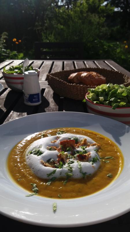 In Keller lungerte vom Herbst noch ein Butternut herum, den gab es heute als Suppe: mit Chili, Knoblauch, Ingwer, Kaffirlimette und einigen anderen Gewürzen.Dazu gab es frischen Koriander, Milchschäumchen und Grillkäse als Einlage.