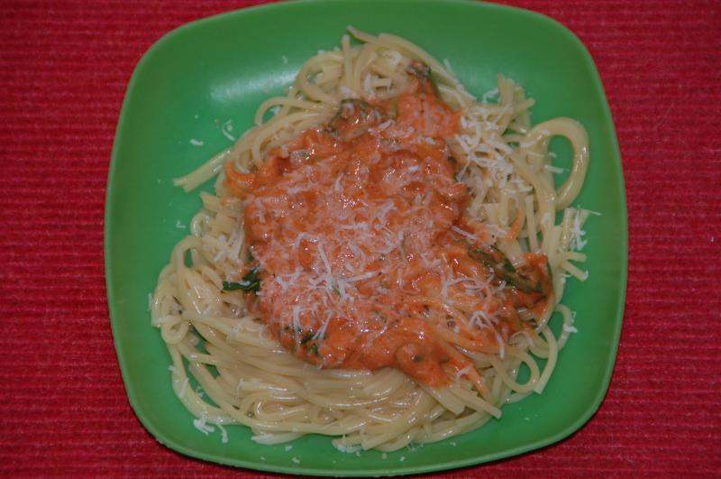 .Gestern war ich auf ner Weiterbildung. Heute gab es Spaghetti mit Standardsoße (pass. Tomaten, Frischkäse, Knoblauch, Salz, diesmal auch noch Stangensellerie dazu) und Parmesan.