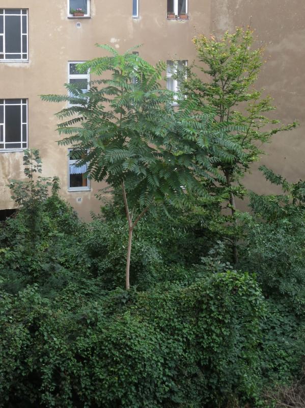 Götterbaum paßt schon. Der wächst in städtischen Innenhöfen, wo er rasch wächst und sich stark vermehren kann. Hab ich auch erlebt.