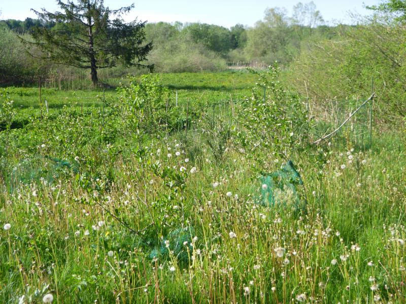 Auf dem 10m breiten Streifen haben wir unseren Gemüsegarten, die Himbeeren, die Stachelbeeren, Josta und Johannisbeeren.