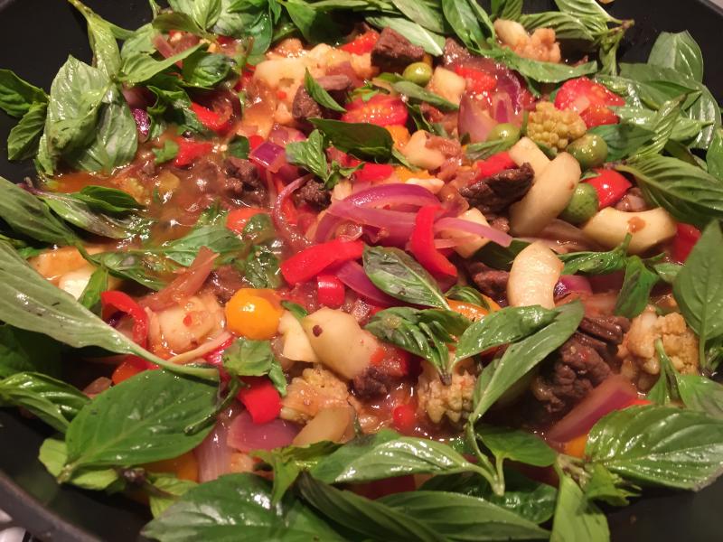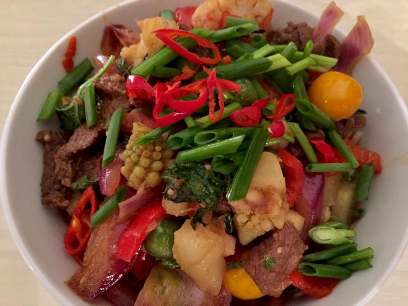 mir war nach was gesundem und nach thailändischer küche und ein mini-romanesco und -blumenkohl mussten endlich weg. dazu kaufte ich noch etwas bio-rindfleisch...