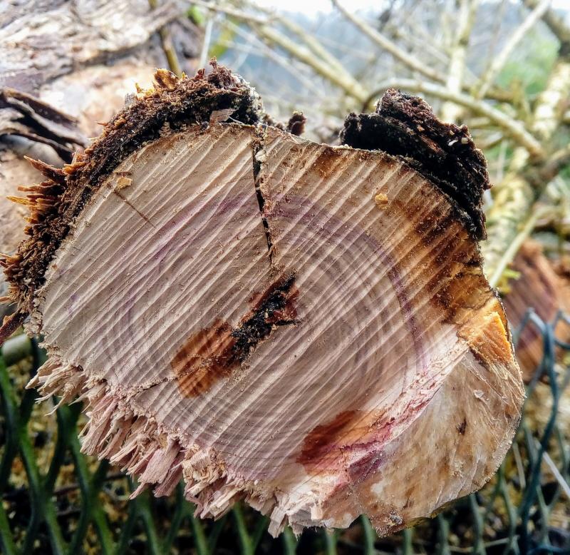 Hier der Übergang vom Holzinneren zur Außenseite. Außen kann man deutlich eine dunkle Verfärbung sehen. Das Holz ist außen feucht, es nieselt. Farbe weicht deshalb leicht ab.