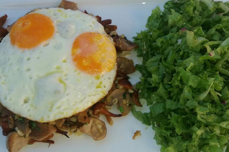 Es gab Roastbeef vom Grill, NT gegart. Dazu frittierte Kartoffelscheiben, Rest Tzatziki vom Vortag und "Salat" aus 27 (hab mitgezählt ;)) verschiedenen Dingen aus dem Garten.