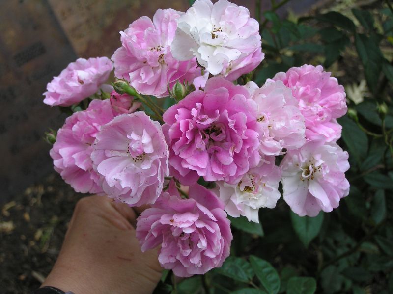 Einmal quäle ich euch noch mit meiner Unbekannten. Also, momentan ist sie erst kniehoch, hat viele Blütenbüschel aber nur 2 längere neue Triebe. Fragezeichen kenne ich, ist es nicht. Von Hermann Schmidt habe ich kein Foto ergoogelt. Rosmarie Viaud hat Ähnlichkeiten, aber nur beim Aufblühen. Das neue Foto zeigt jetzt das Farbspektrum einige Tage nach dem Aufblühen. Über die Antwort von Praskac werde ich euch dann informieren.Mit vielen Grüßen, Jutta
